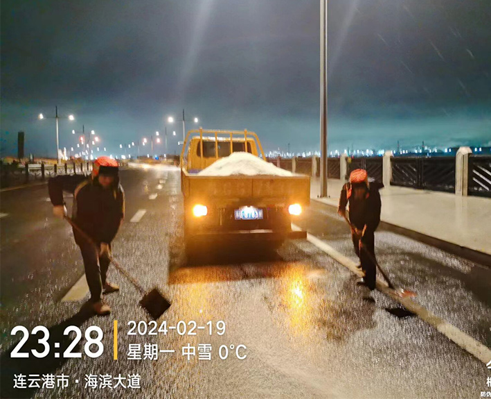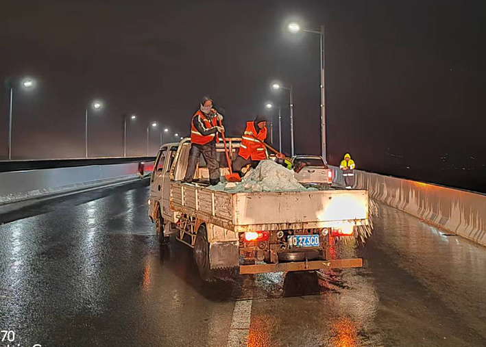 該公司迅速啟動突發(fā)天氣應(yīng)急保障預(yù)案,近30余名道路應(yīng)急排險(xiǎn)突擊隊(duì)員,在公司統(tǒng)一按排下 ,裝車備運(yùn)融雪鹽斤近15噸,現(xiàn)場工作中隊(duì)員們士氣高漲,無所畏懼。夜間8時(shí)左右,10余名黨員先鋒,兵分三路再次安全有序奔赴燒香河、海濱大道、228等路段橋梁,無懼大風(fēng)夾著冰雨顆粒吹打臉頰,兩人一對、三人一組、揮動手中鐵銑,汗水與冰雨濕透橙色衣衫,經(jīng)過近4個(gè)多小時(shí)努力奮戰(zhàn),人工撒放融雪鹽斤近20余噸,高質(zhì)高效保障近30座橋梁安全通暢。