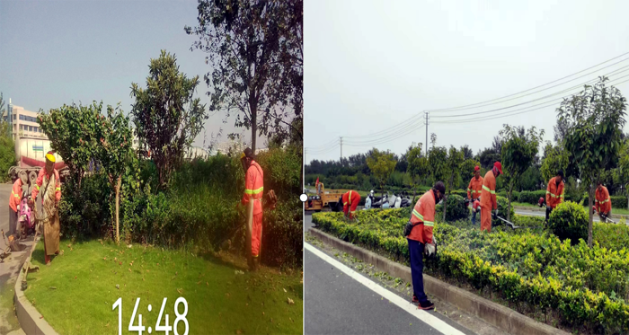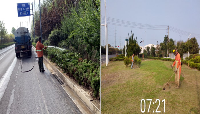 8月底,綠化養(yǎng)護班組兵分兩路強化綠地草坪進行疏草、除雜等養(yǎng)護工作,對綠植進行清枯枝、病蟲枝整形修剪,保持喬灌木的整體外形美觀;集中力量加固樹撐,清除雜草2萬余平方米。