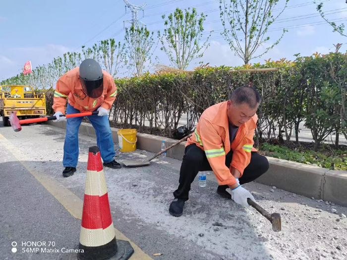 228省道西側(cè),班長姚功巡查時發(fā)現(xiàn),有近50多米長混凝土攪伴物拋灑主干道路面,如不及時處理,嚴(yán)重影響路面行車安全。班長姚功及時召集隊(duì)員,馬不停蹄趕赴道路現(xiàn)場。上午10時左右,室外氣溫已經(jīng)直逼35℃,大家顧不上天氣的炎熱,揮動手中鐵錘,不停地震動路面“凍結(jié)”已久的水泥,黨員胡可貴與同事徐育軍、伏彩林主動參戰(zhàn),交替使用手中的撬棍,盡管汗水浸透橙色衣衫,雙手磨出了血泡,大家也沒有叫苦叫累,經(jīng)過近三個多小的努力奮戰(zhàn),終于恢復(fù)原有黑色柏油路面。